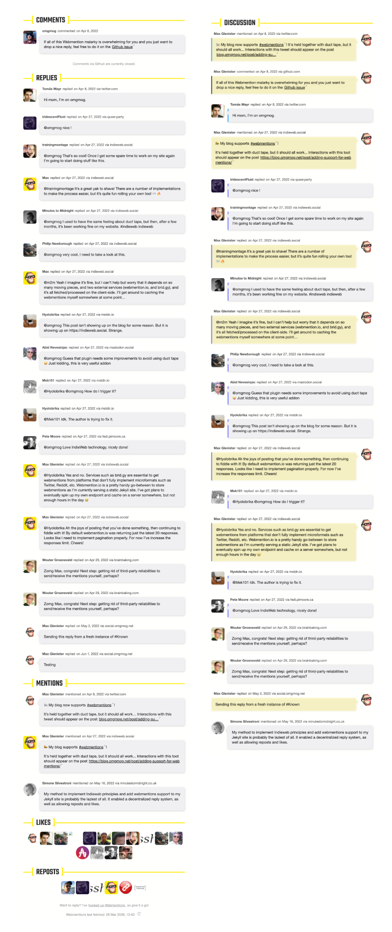 With the data files in the repo, Jekyll renders the mentions at build time using standard Liquid templates. The discussion section is in the HTML before anything loads. The JS still runs to pick up anything that’s arrived since the last build, tracks which IDs were already rendered to avoid duplicates, and re-sorts the feed chronologically. The page passes the pre-rendered IDs to the JS as two Sets: