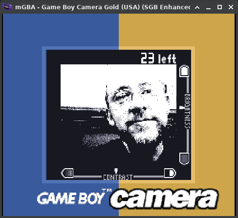 With the camera already working, I launched mgba-qt with the GB Camera ROM. mGBA has a camera sensor backend that maps a V4L2 device to the cartridge’s sensor interface, so it picked up /dev/video0 without any extra configuration.