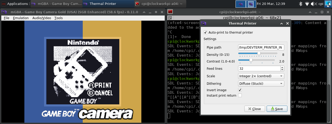 So I did what any reasonable person would do: forked mGBA and added thermal printer support directly to the Qt frontend. When the emulated GB Printer receives a print job, it now fires straight to the DevTerm’s printer with no file saved and no dialog to click through. The image gets scaled up, contrast-adjusted, dithered to 1-bit monochrome, and sent as an ESC/POS bitmap command, all in one step. The printer auto-attaches when any GB game loads, so the game always sees it as connected.