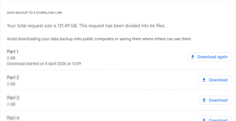 I requested a full Takeout export and it came back as 66 zip files, about 2GB each, 131GB total. My NAS has the space; my laptop does not. I didn’t fancy downloading it locally just to copy it across, so I worked out how to pull it straight to the server.