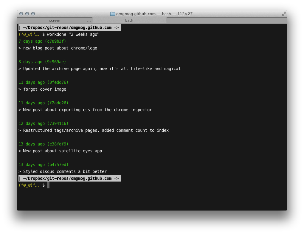 If you’re using a ticketing system such as JIRA it’s quite easy to get a list of the tickets you’ve been working on or completed previously, but what about those little tweaks that didn’t fit in a specific ticket? I find that the git commit log, when used with sane/thoughtful commit messages is a good way to get a list of the things that you’ve done in a given period of time.