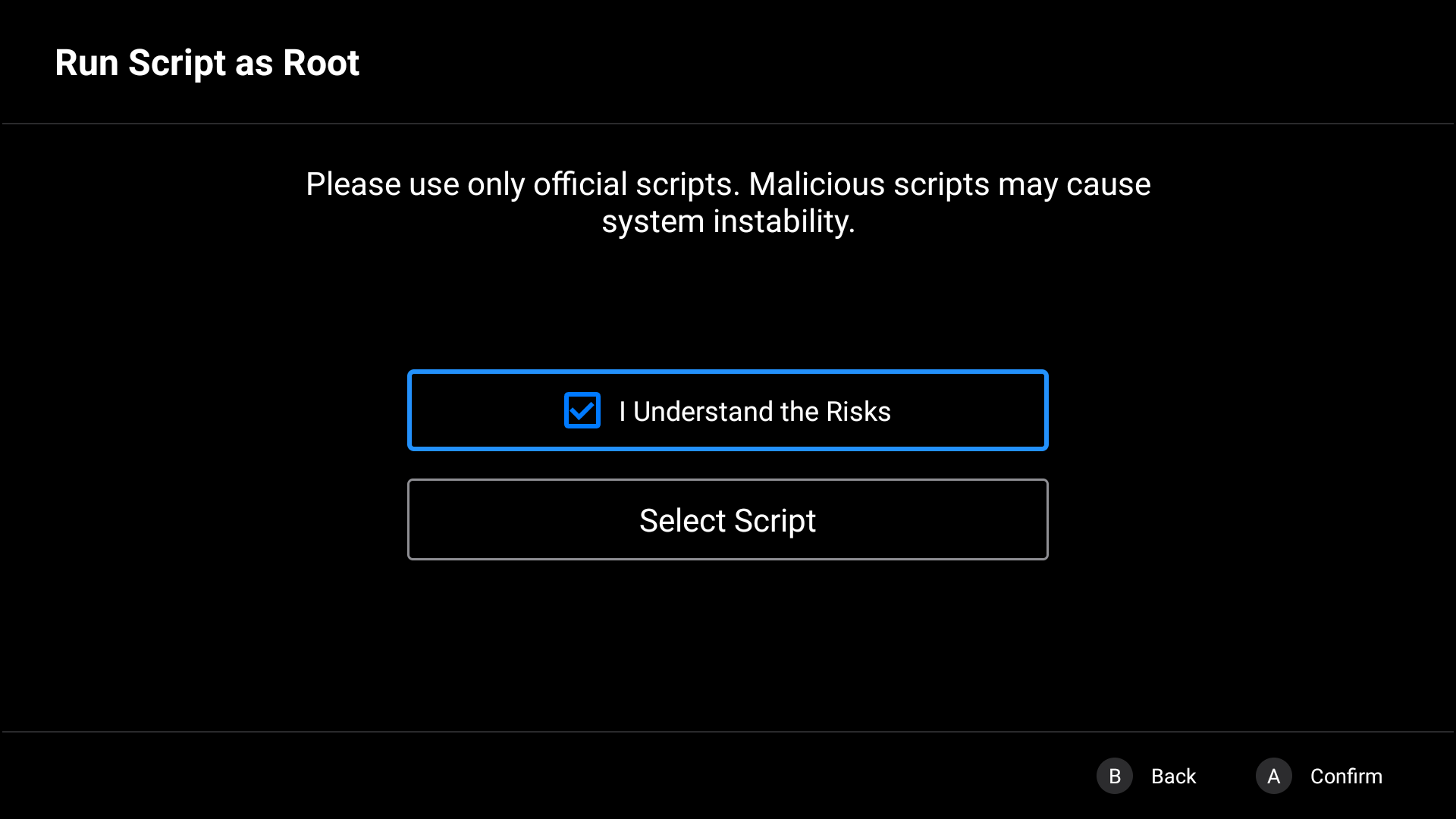 I needed another approach. The Mangmi firmware includes a GUI option to run scripts as root, which I’ve not seen on other Android handhelds. I used this to dump any information I could about the update system: