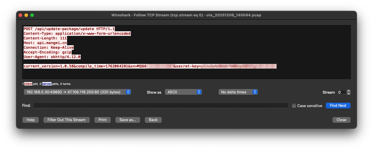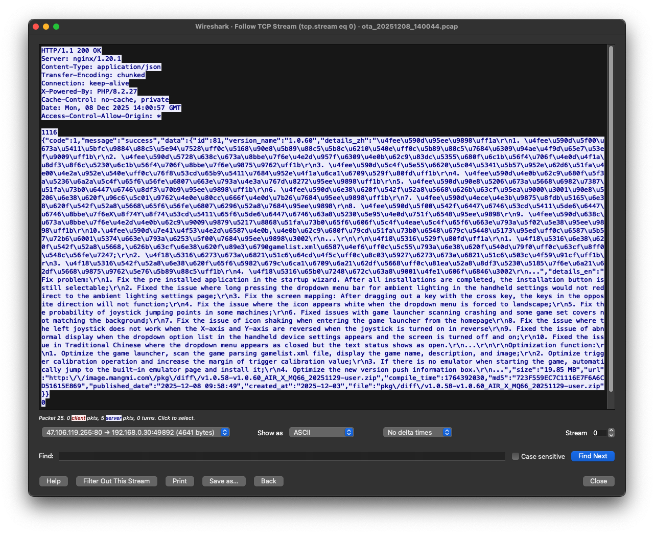 This confirmed that the OTA directories existed but I couldn’t directly access the URLs or changelog text from the logs. I considered setting up mitmproxy to intercept HTTPS traffic, but that would’ve required installing certificates on the device and dealing with certificate pinning if Mangmi’s OTA updater uses it.