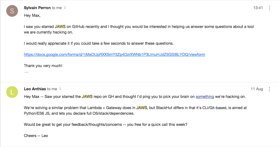 Lately I’ve been directly receiving emails relating to a repository I had starred on GitHub. Though I’m all for new/related things being brought to my attention, I find impersonal direct contact like this to be very invasive.