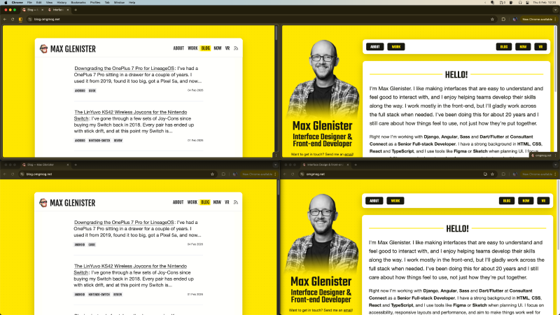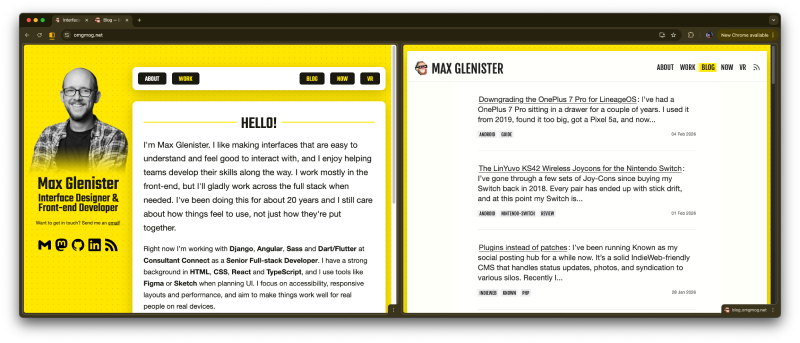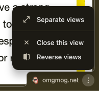 Chrome’s split view tabs is one of those features that silently arrived and slipped into my workflow. I’ve found myself using it more and more over the past couple of weeks since it rolled out at the end of 2025. It’s as intuitive as tab grouping (hold shift when selecting multiple tabs), and genuinely useful. The kind of feature that slots in and makes me wonder how I managed without it.