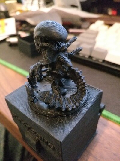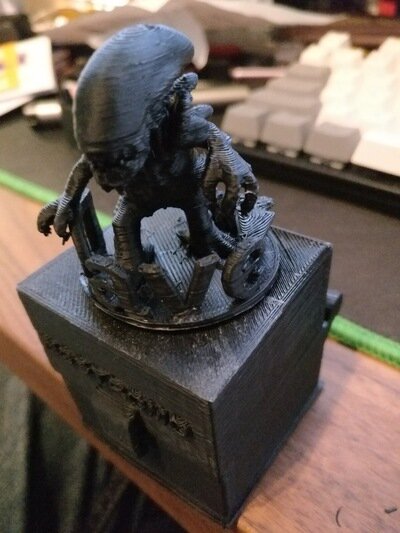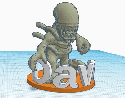 I found a nice model of a Xenomorph Guard on Thingiverse and using Tinkercad stuck it on a base with his name.
